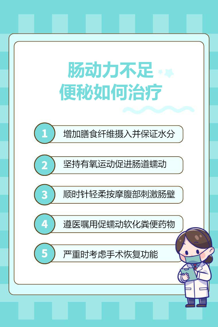肠动力不足便秘可通过饮食调整、适当运动、腹部按摩、药物治疗、手术治疗等方法来改善。