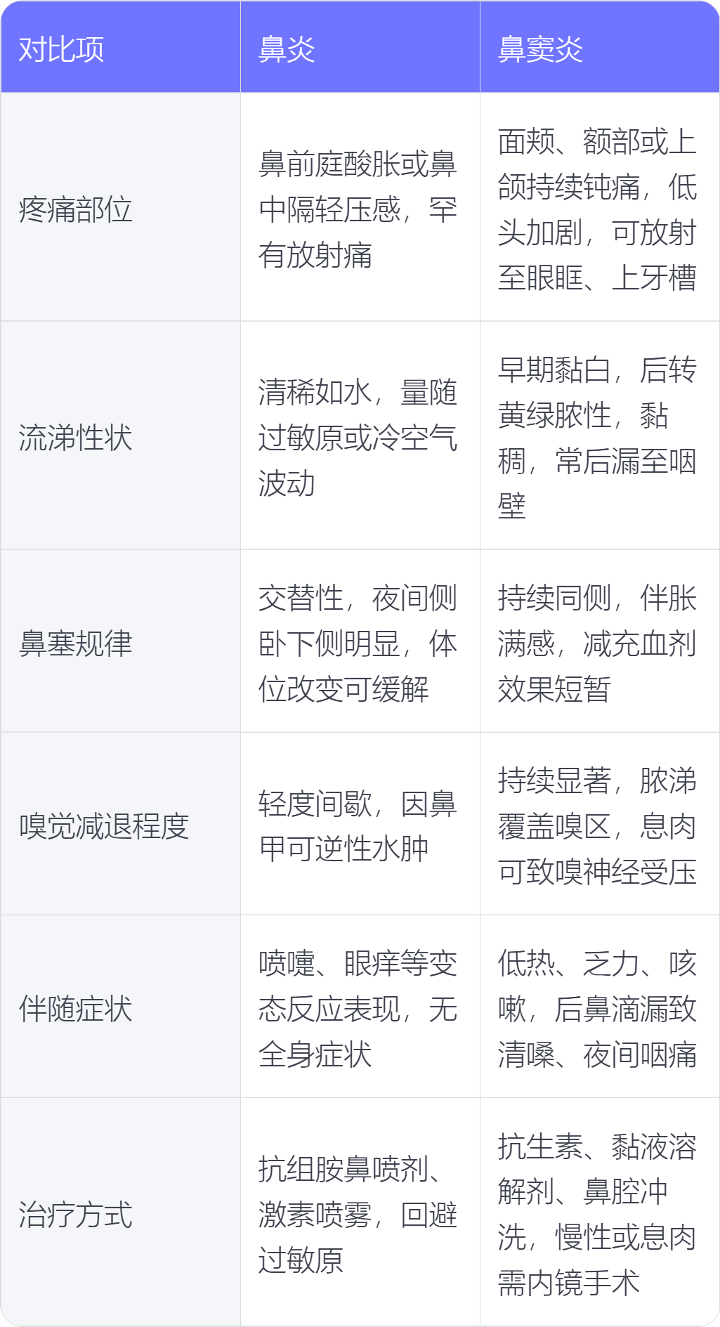 鼻窦炎与鼻炎在疼痛部位、流涕性状、鼻塞规律、嗅觉减退程度、伴随症状、治疗方式上各具差异。