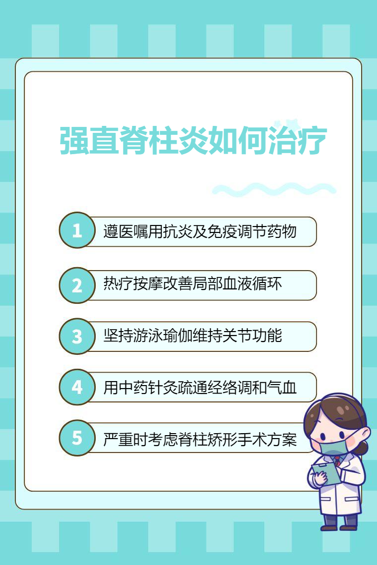 强直脊柱炎的治疗方法主要有药物治疗、物理治疗、运动锻炼、中医治疗、手术治疗等。