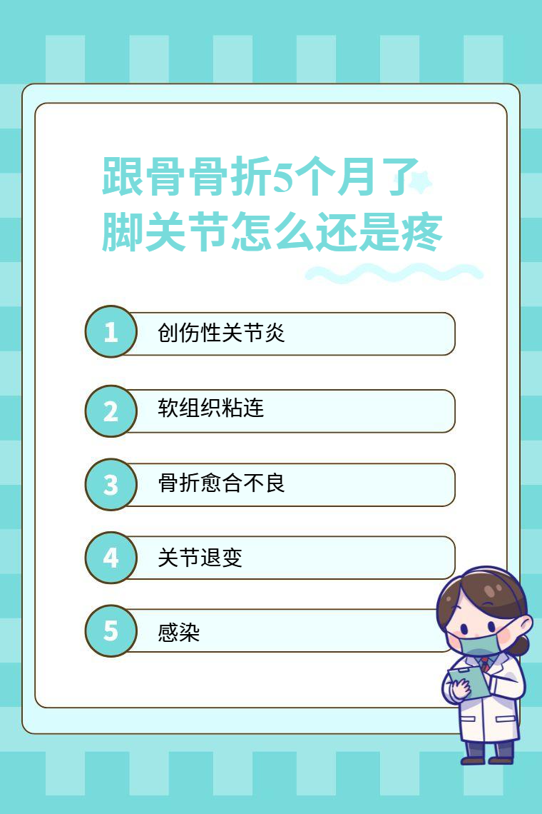跟骨骨折5个月后脚关节仍疼可能是创伤性关节炎、软组织粘连、骨折愈合不良、关节退变、感染等。