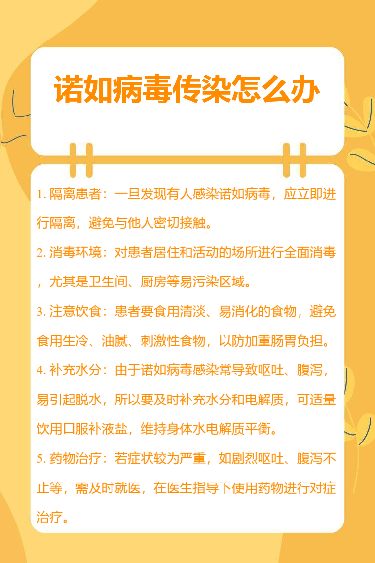 1. 隔离患者:一旦发现有人感染诺如病毒,应立即进行隔离,避免与他人密切接触,防止病毒进一步传播扩散,患者需待症状完全消失后72小时方可解除隔离。