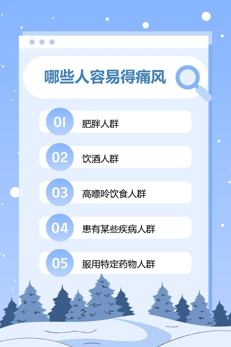肥胖人群、饮酒人群、高嘌呤饮食人群、患有某些疾病人群、服用特定药物人群等容易得痛风。