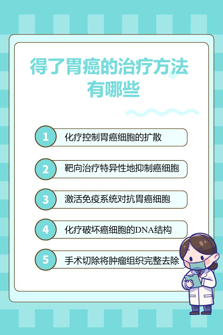 胃癌的治疗方法有化疗、靶向治疗、免疫治疗、放疗、手术治疗等。