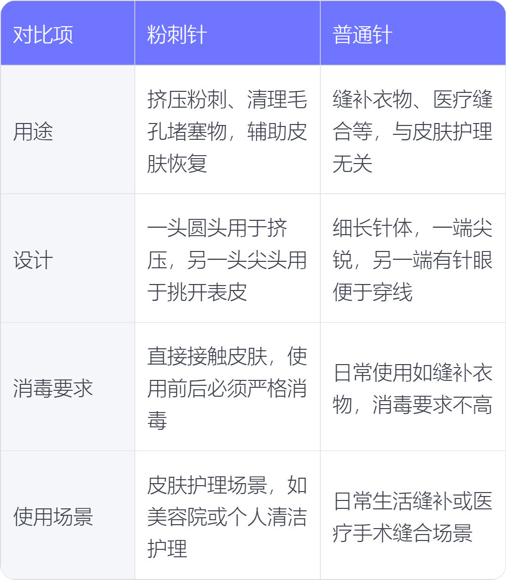 粉刺针与普通针在用途、设计、材质、消毒要求、使用场景上存在不同。