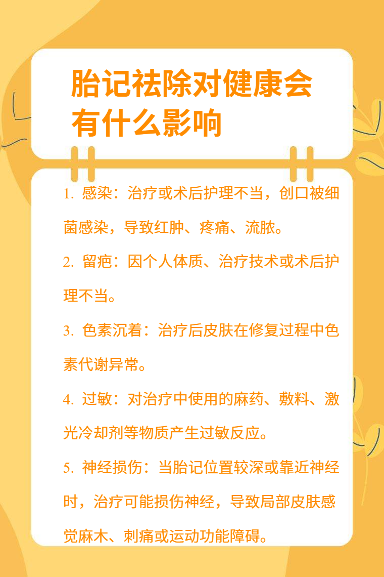 胎记祛除可能存在感染、留疤、色素沉着、过敏、损伤神经等影响。