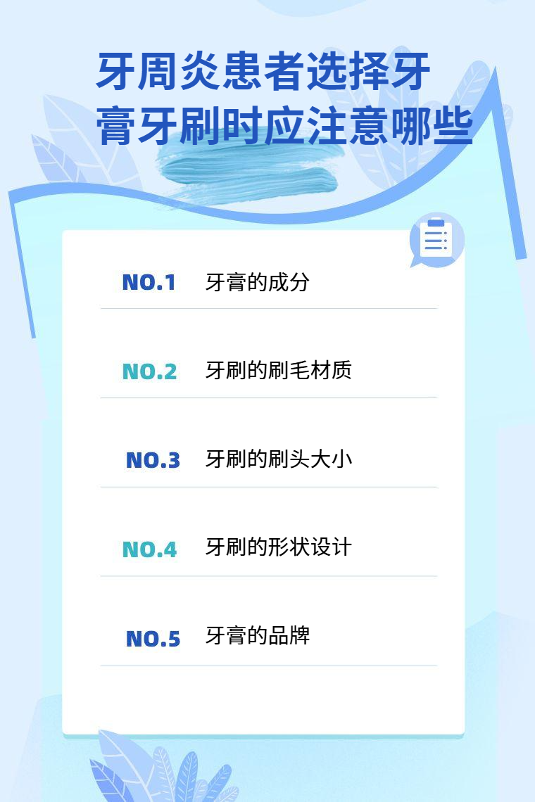 牙周炎患者选择牙膏牙刷时应注意牙膏的成分、牙刷的刷毛材质、牙刷的刷头大小、牙刷的形状设计、牙膏的品牌等。
