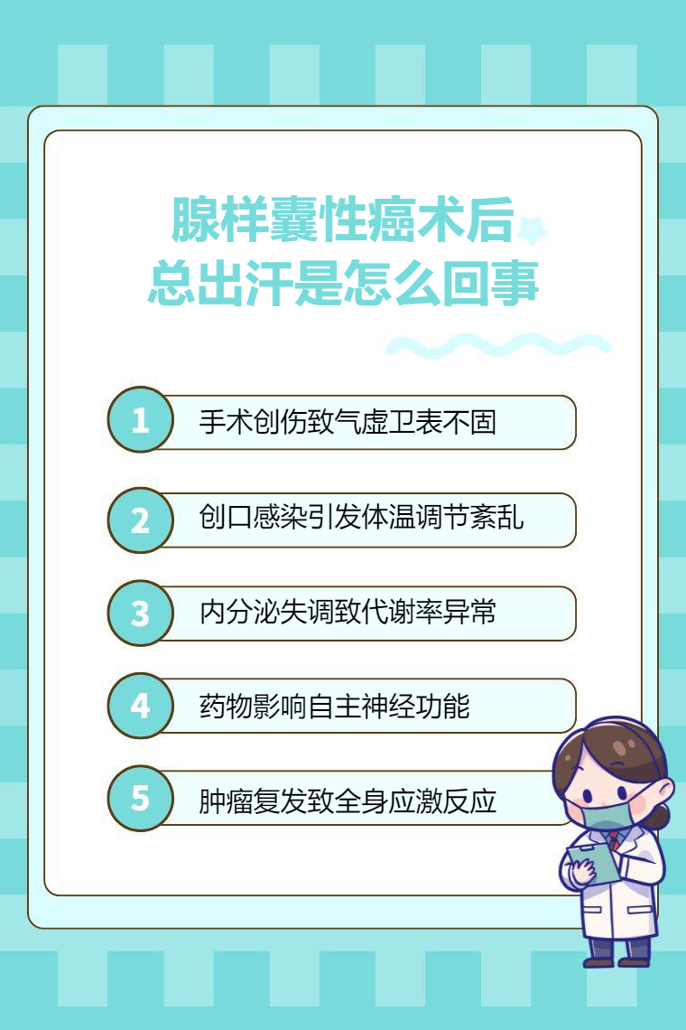 腺样囊性癌术后总出汗可能是身体虚弱、术后感染、内分泌紊乱、药物副作用、肿瘤复发转移等情况。