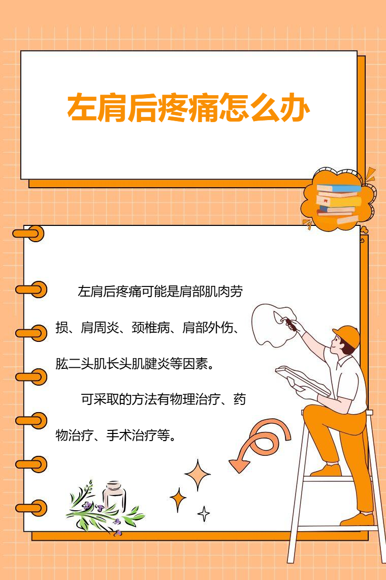 左肩后疼痛可能是肩部肌肉劳损、肩周炎、颈椎病、肩部外伤、肱二头肌长头肌腱炎等因素。需要针对病因治疗,可采取的方法有物理治疗、药物治疗、手术治疗等。