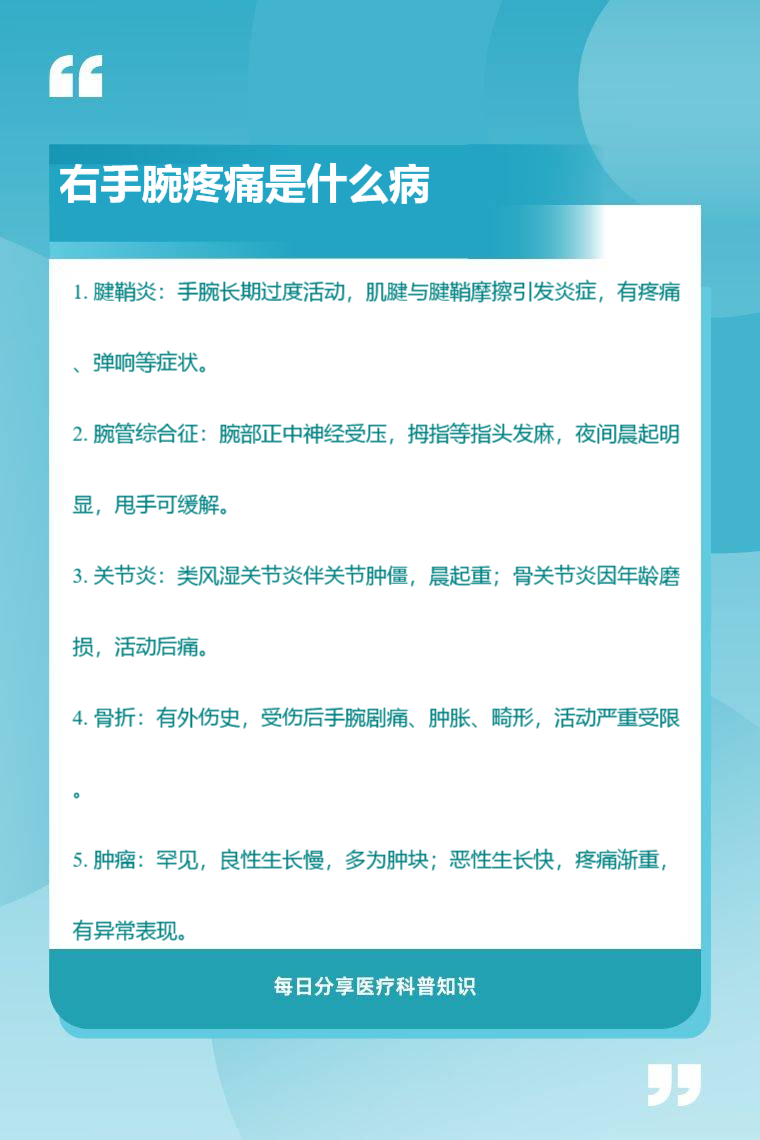 右手腕疼痛可能由腱鞘炎、腕管综合征、关节炎、骨折、肿瘤等引起。