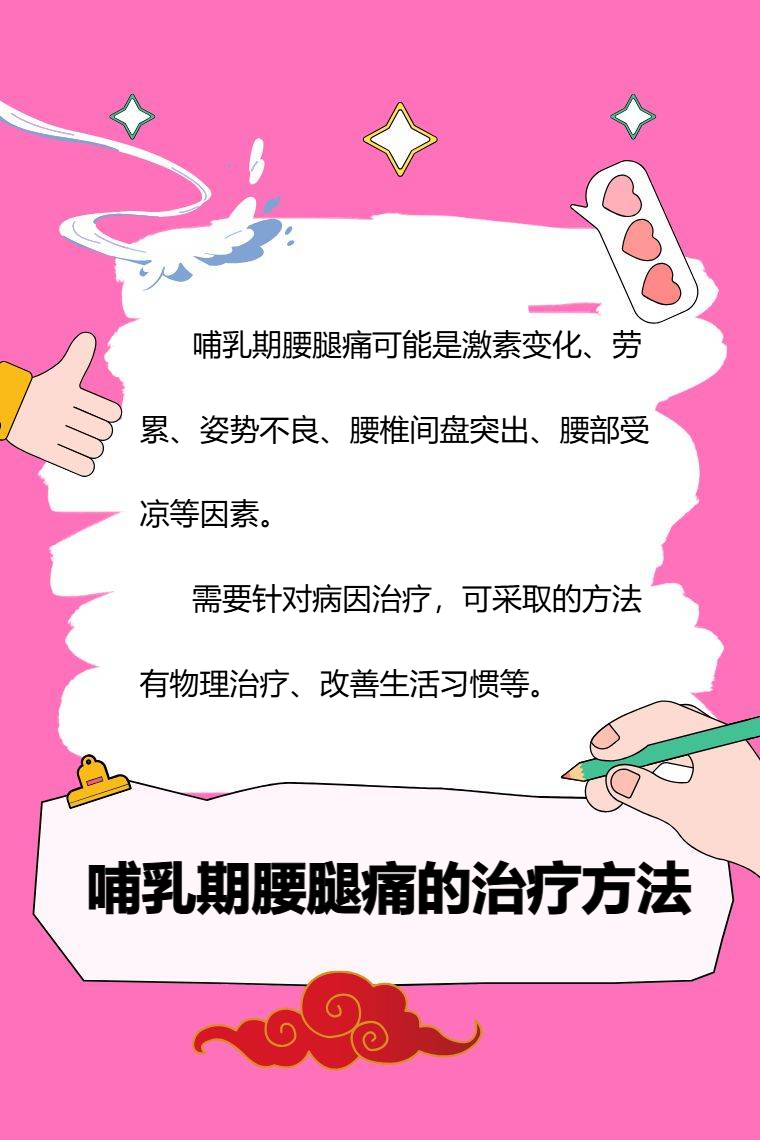 哺乳期腰腿痛可能是激素变化、劳累、姿势不良、腰椎间盘突出、腰部受凉等因素。需要针对病因治疗,可采取的方法有物理治疗、改善生活习惯等。