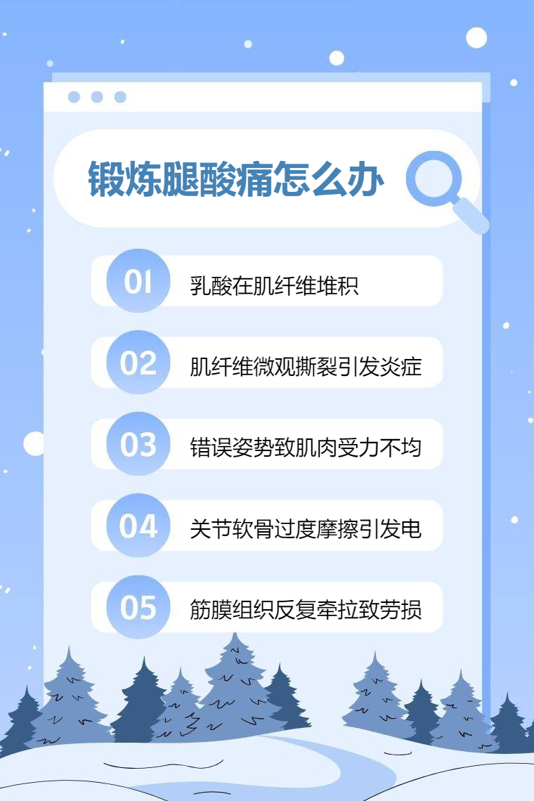 1. 乳酸堆积:锻炼时身体进行无氧呼吸产生乳酸,堆积在腿部肌肉中,就会引起酸痛。一般通过休息、适当拉伸,促进乳酸代谢,症状可逐渐缓解。还可进行热敷,用热毛巾或热水袋敷在酸痛部位,每次15 - 20分钟,每天3 - 4次,能促进血液循环,减轻酸痛感。