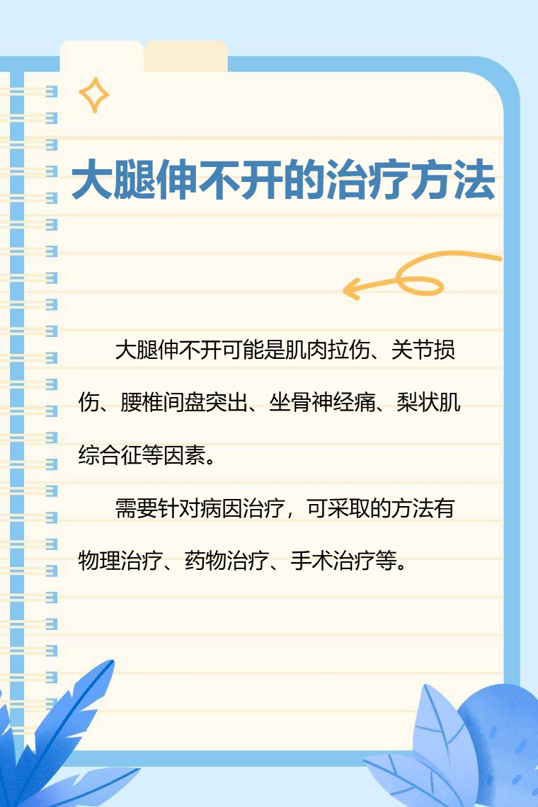 大腿伸不开可能是肌肉拉伤、关节损伤、腰椎间盘突出、坐骨神经痛、梨状肌综合征等因素。需要针对病因治疗,可采取的方法有物理治疗、药物治疗、手术治疗等。