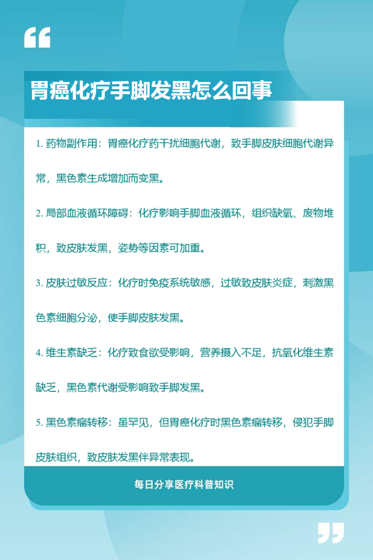 胃癌化疗手脚发黑可能是由药物副作用、局部血液循环障碍、皮肤过敏反应、维生素缺乏、黑色素瘤转移等情况引起。