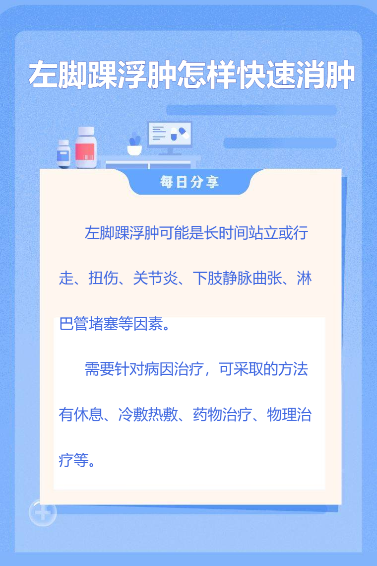 左脚踝浮肿可能是长时间站立或行走、扭伤、关节炎、下肢静脉曲张、淋巴管堵塞等因素。需要针对病因治疗,可采取的方法有休息、冷敷热敷、药物治疗、物理治疗等。