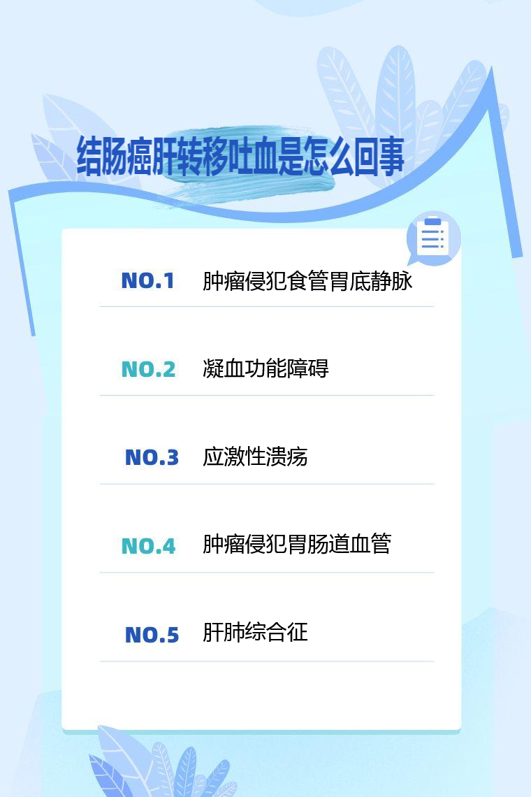 结肠癌肝转移吐血常见原因有肿瘤侵犯食管胃底静脉、凝血功能障碍、应激性溃疡、肿瘤侵犯胃肠道血管、肝肺综合征等。