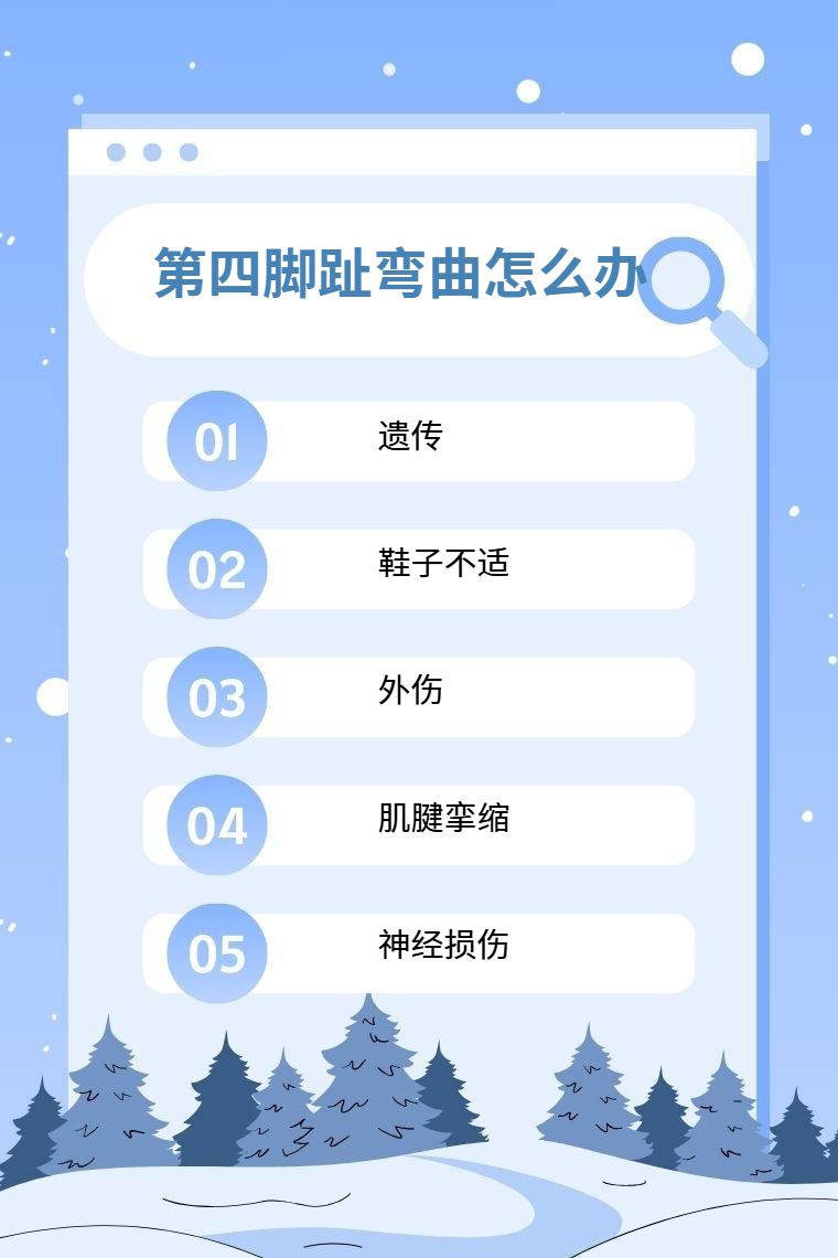 第四脚趾弯曲可能是遗传、鞋子不适、外伤、肌腱挛缩、神经损伤等因素,需要针对病因治疗,可采取的方法有手术、康复训练、更换合适鞋子等。