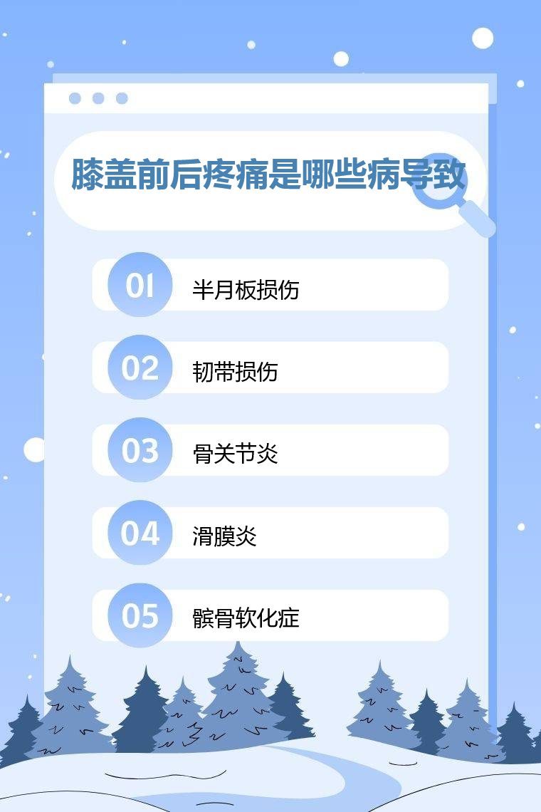 膝盖前后疼痛可能由半月板损伤、韧带损伤、骨关节炎、滑膜炎、髌骨软化症等导致。