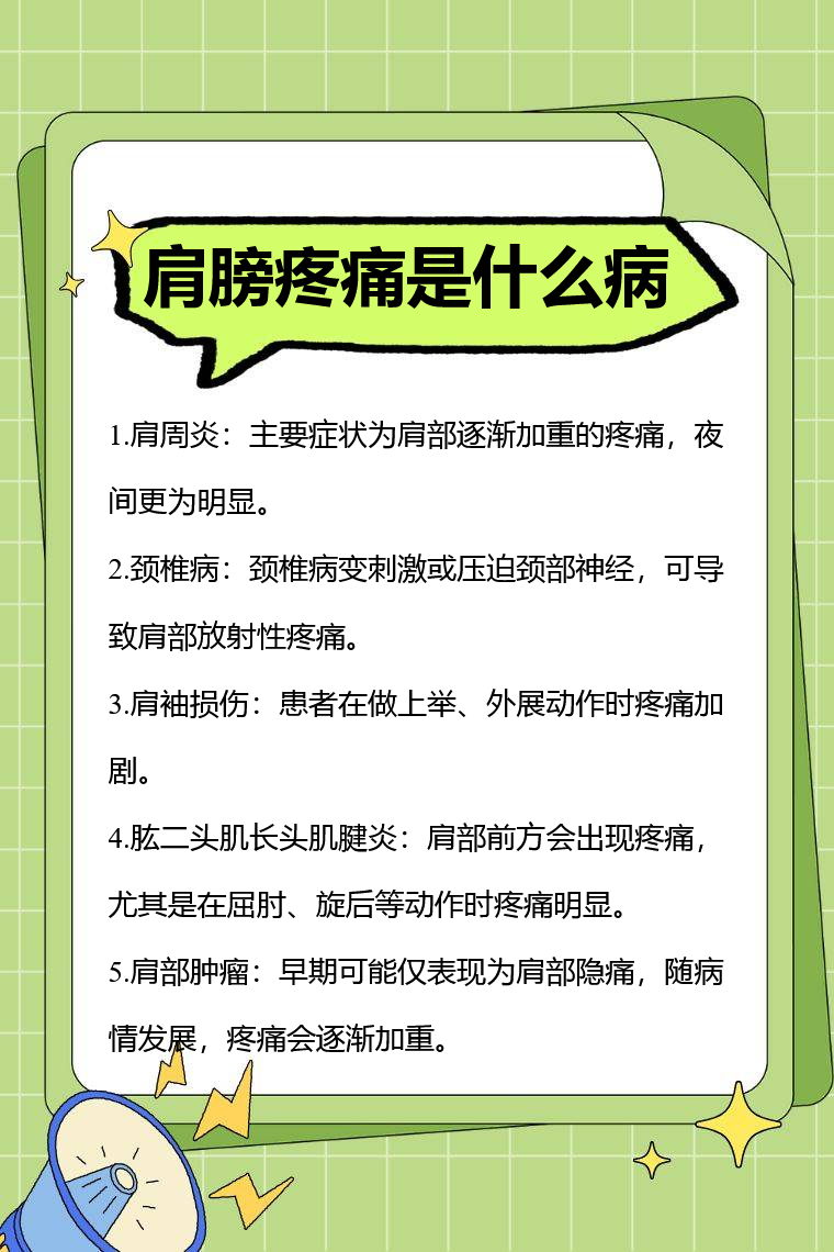 肩膀疼痛可能由肩周炎、颈椎病、肩袖损伤、肱二头肌长头肌腱炎、肩部肿瘤等引起。