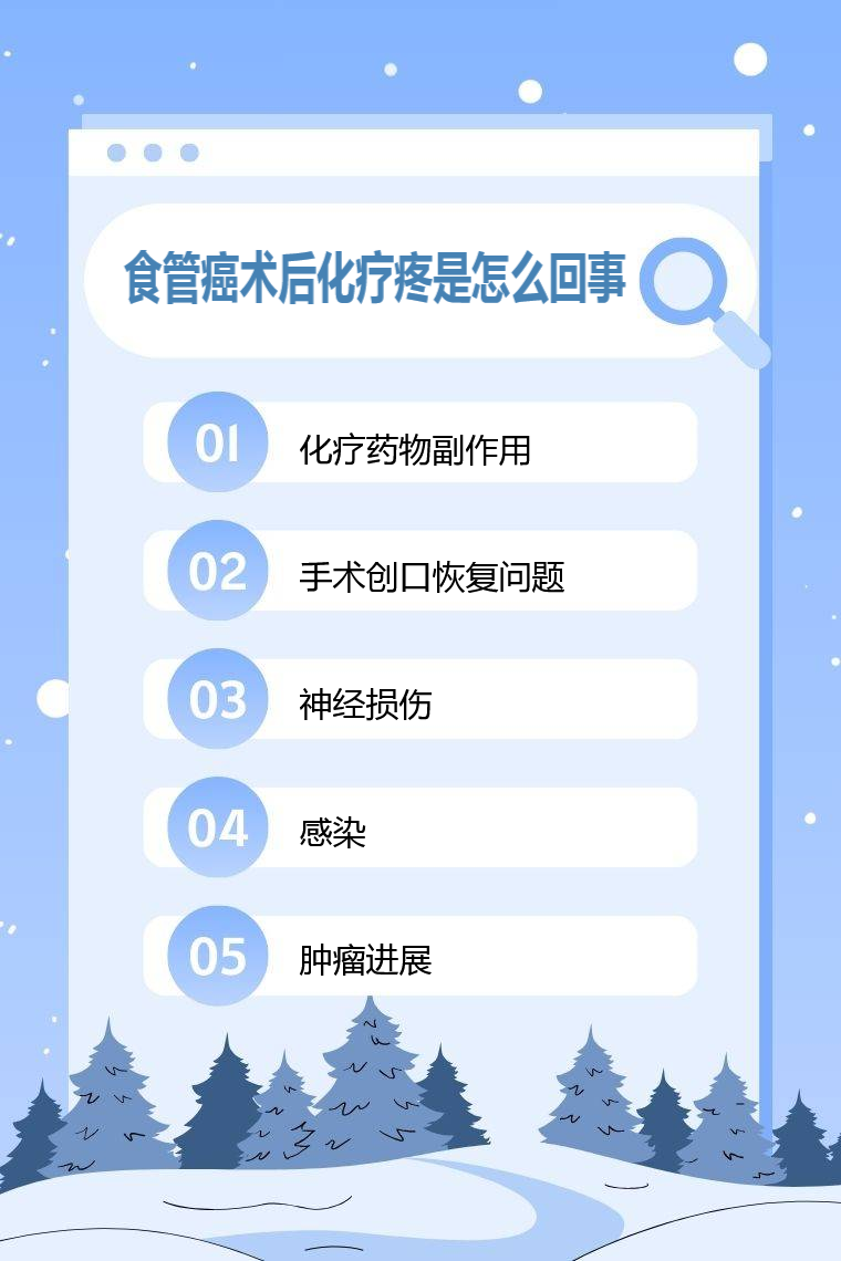 食管癌术后化疗疼可能是由化疗药物副作用、手术创口恢复问题、神经损伤、感染、肿瘤进展等情况导致。