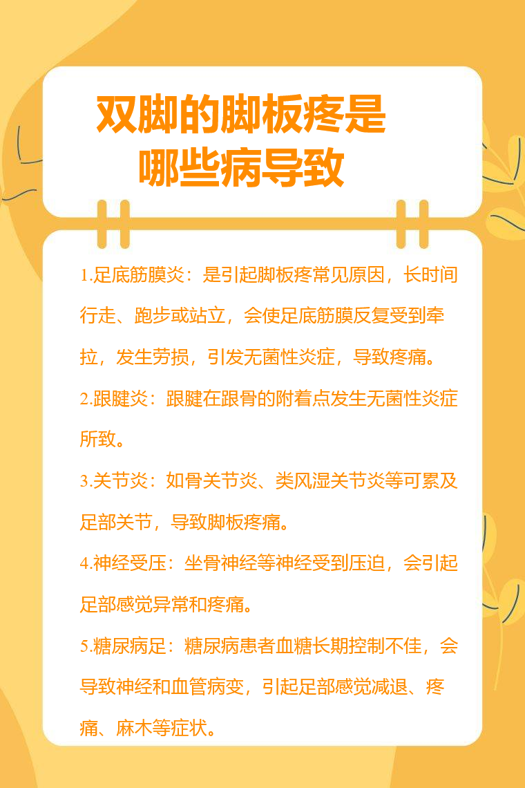 双脚的脚板疼可能由足底筋膜炎、跟腱炎、关节炎、神经受压、糖尿病足等导致。