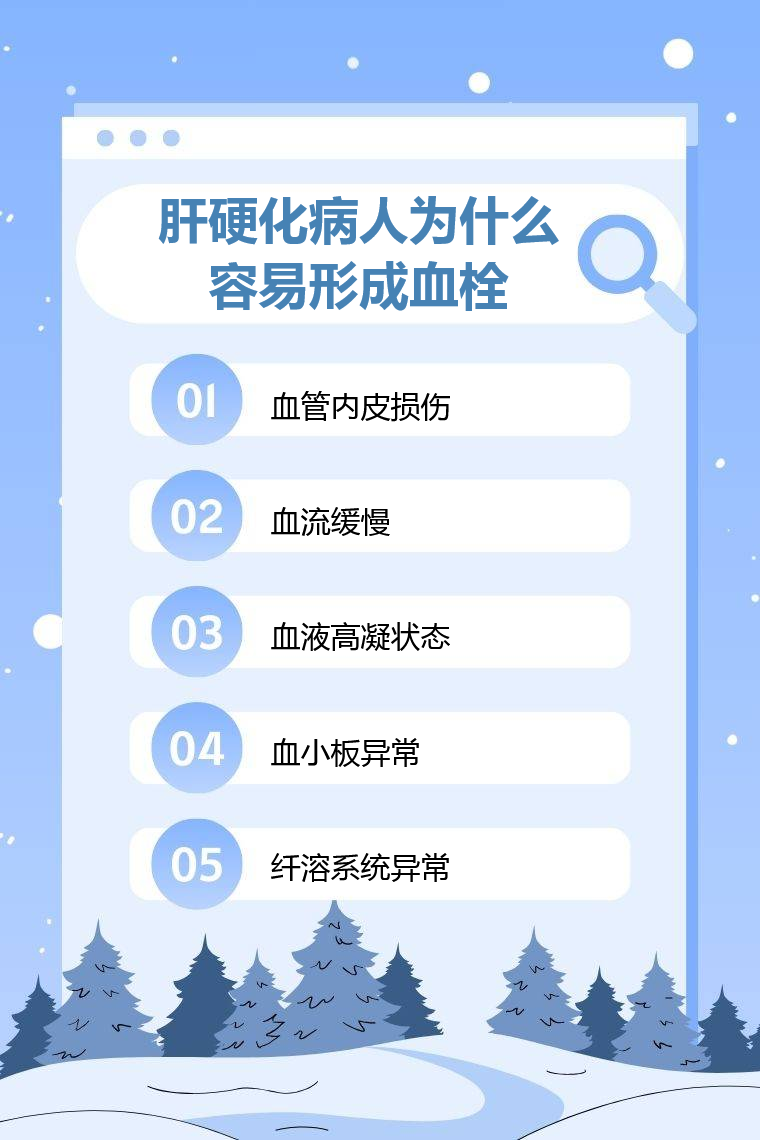 肝硬化病人容易形成血栓的原因包括血管内皮损伤、血流缓慢、血液高凝状态、血小板异常、纤溶系统异常等。
