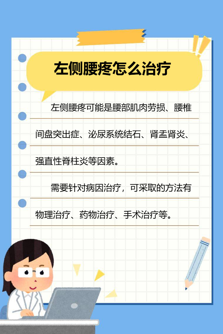 左侧腰疼可能是腰部肌肉劳损、腰椎间盘突出症、泌尿系统结石、肾盂肾炎、强直性脊柱炎等因素。需要针对病因治疗,可采取的方法有物理治疗、药物治疗、手术治疗等。