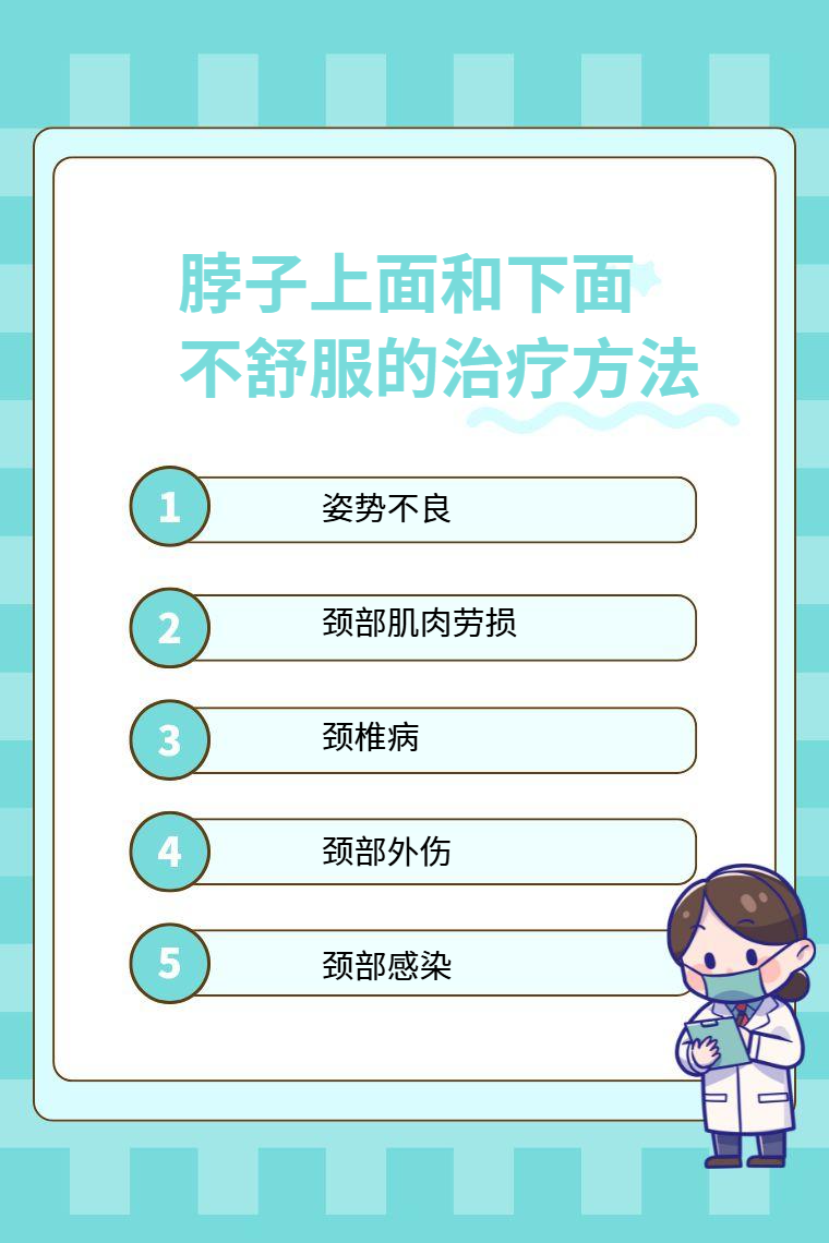 脖子上面和下面不舒服可能是姿势不良、颈部肌肉劳损、颈椎病、颈部外伤、颈部感染等因素,需要针对病因治疗,可采取的方法有改善姿势、物理治疗、药物治疗等。
