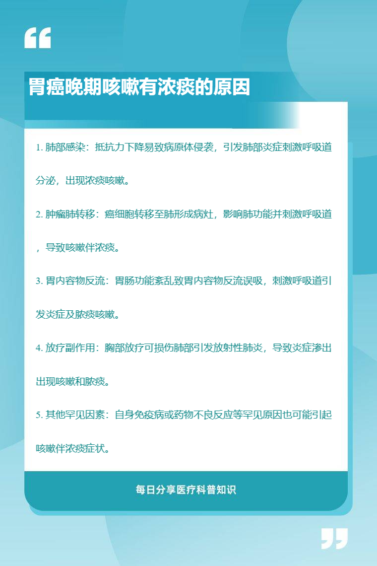 胃癌晚期咳嗽有浓痰的原因包括肺部感染、肿瘤肺转移、胃内容物反流、放疗副作用、其他罕见因素等。