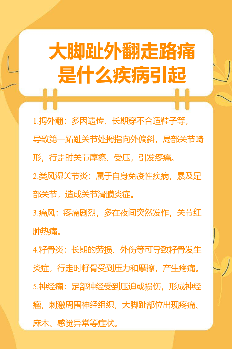 大脚趾外翻走路痛可能由拇外翻、类风湿关节炎、痛风、籽骨炎、神经瘤等引起。