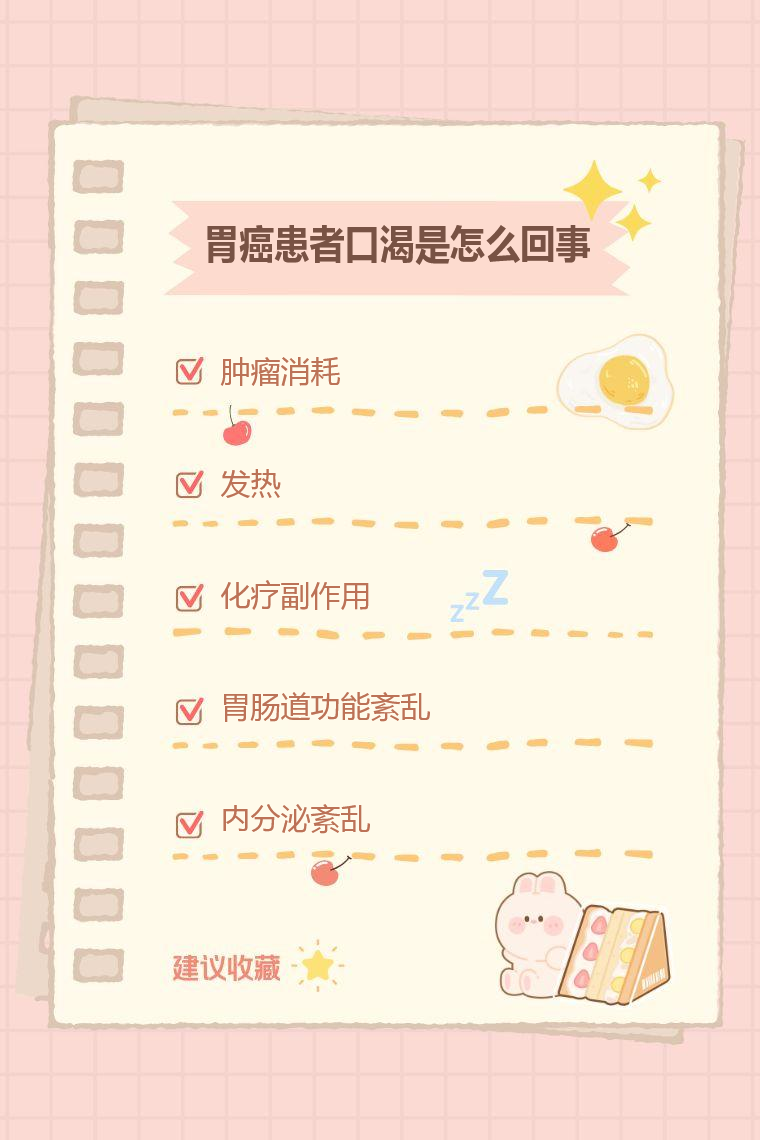 胃癌患者口渴可能是由肿瘤消耗、发热、化疗副作用、胃肠道功能紊乱、内分泌紊乱等引起。
