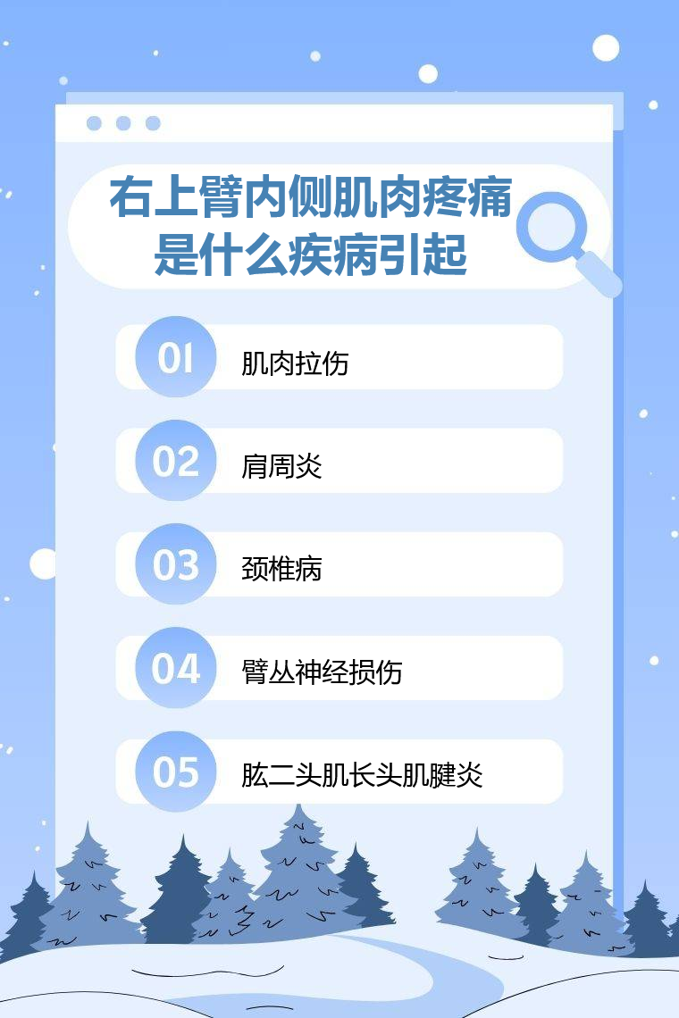 1.肌肉拉伤:多因突然剧烈运动或过度拉伸右上臂内侧肌肉所致,如进行引体向上、投掷等动作时用力过猛,导致肌肉纤维部分断裂或完全断裂,引发疼痛,常伴有局部肿胀、淤血,活动时疼痛加剧。