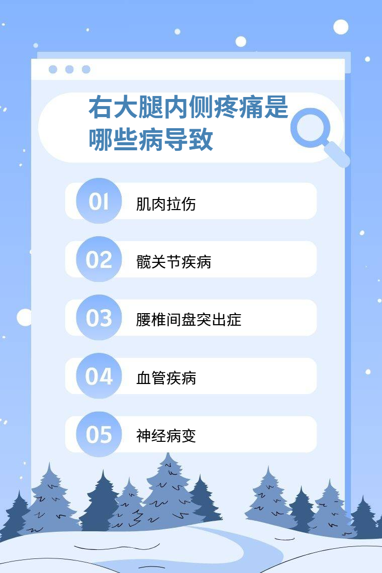 右大腿内侧疼痛可能由肌肉拉伤、髋关节疾病、腰椎间盘突出症、血管疾病、神经病变等导致。