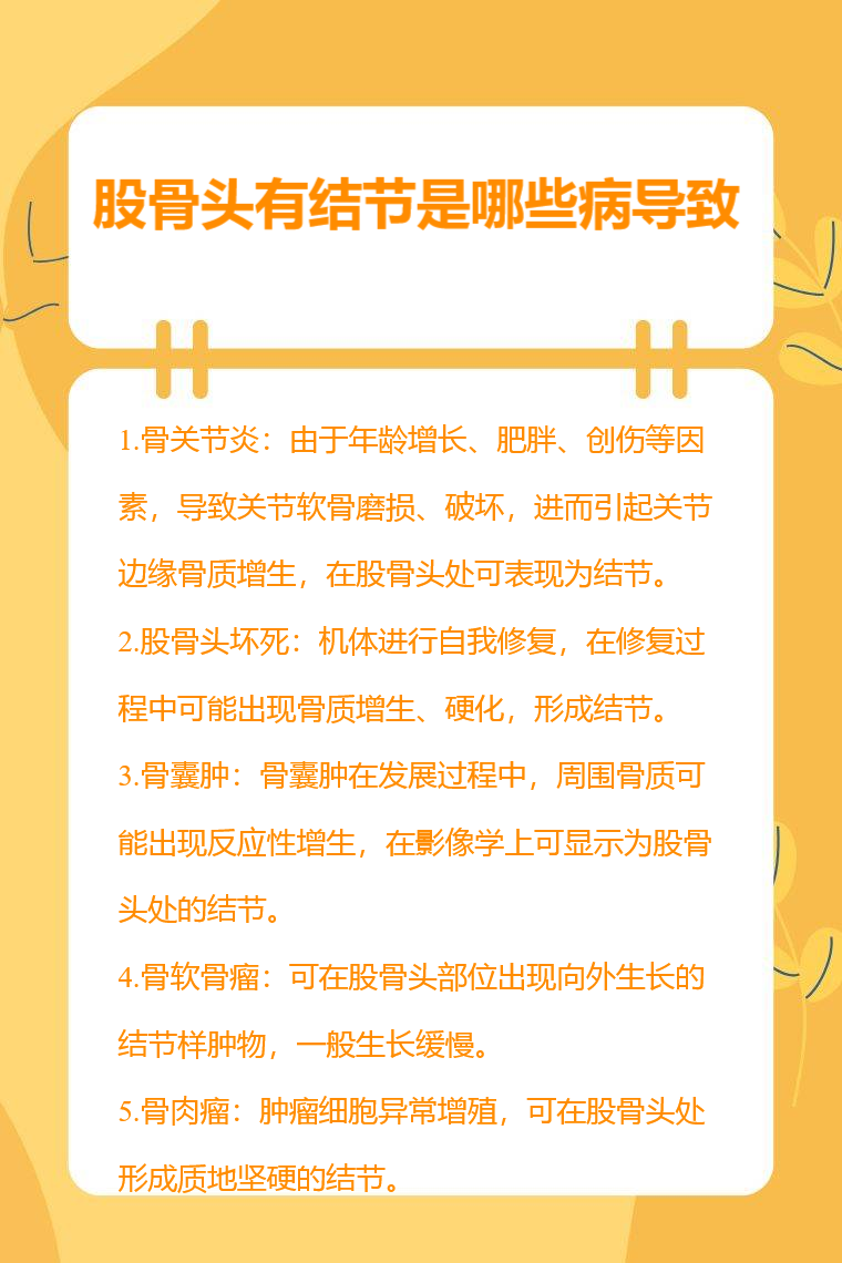 股骨头有结节可能由骨关节炎、股骨头坏死、骨囊肿、骨软骨瘤、骨肉瘤等导致。