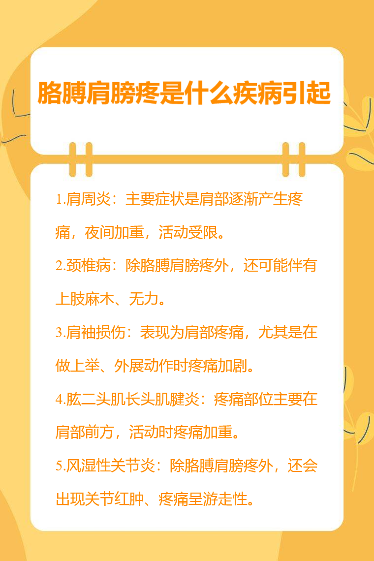 胳膊肩膀疼可能由肩周炎、颈椎病、肩袖损伤、肱二头肌长头肌腱炎、风湿性关节炎等引起。
