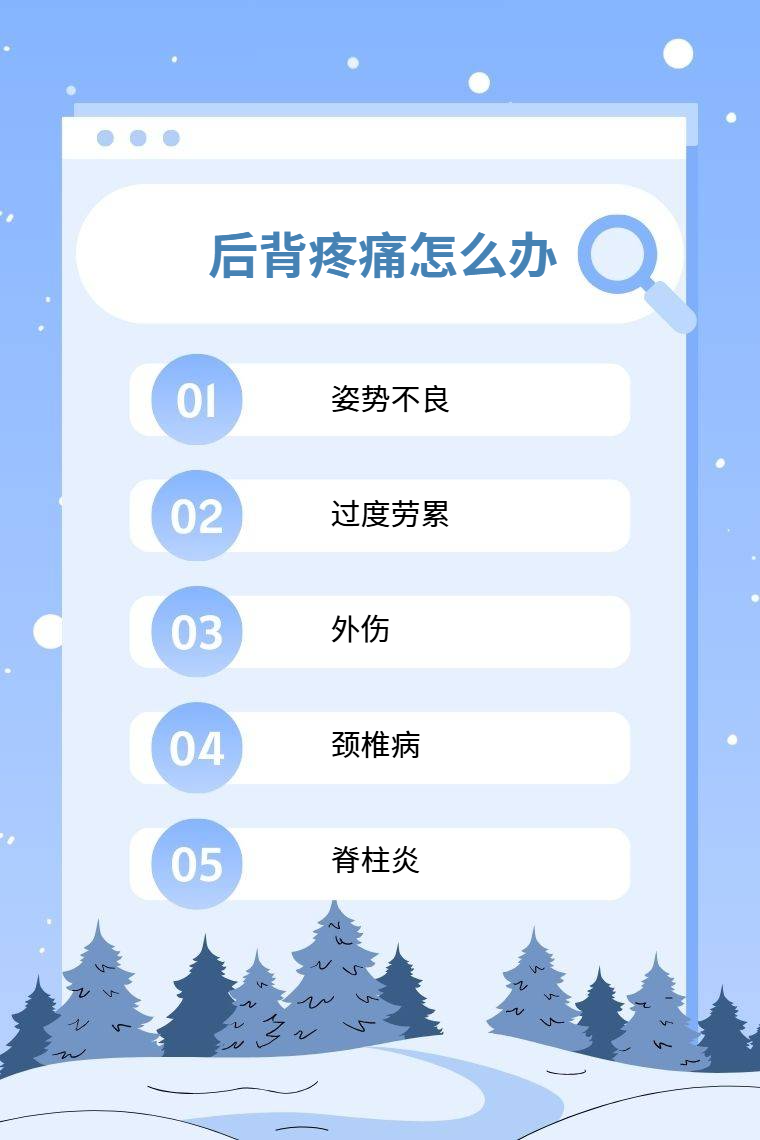 1. 姿势不良:长期保持不正确的坐姿、站姿,如弯腰驼背、低头等,会使后背肌肉处于紧张状态,时间久了就会引发疼痛。应及时调整姿势,保持挺胸抬头,避免长时间维持同一不良姿势,工作或学习一段时间后起身活动,舒展身体,缓解肌肉紧张。