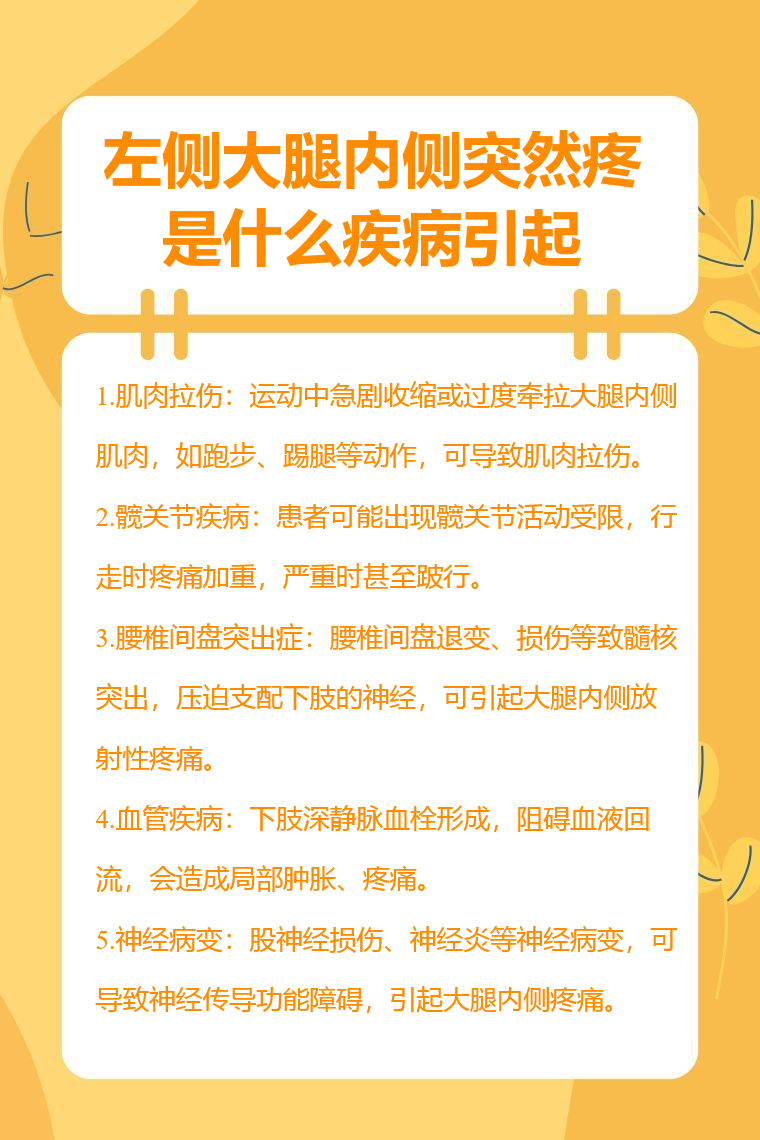 左侧大腿内侧突然疼可能由肌肉拉伤、髋关节疾病、腰椎间盘突出症、血管疾病、神经病变等引起。