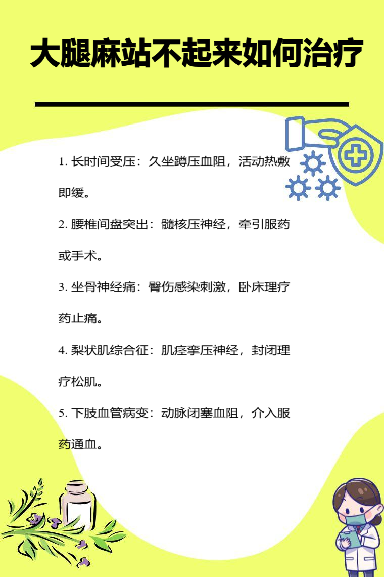 大腿麻站不起来可能是长时间受压、腰椎间盘突出症、坐骨神经痛、梨状肌综合征、下肢血管病变等因素,需要针对病因治疗,可采取的方法有物理治疗、药物治疗、手术治疗等。