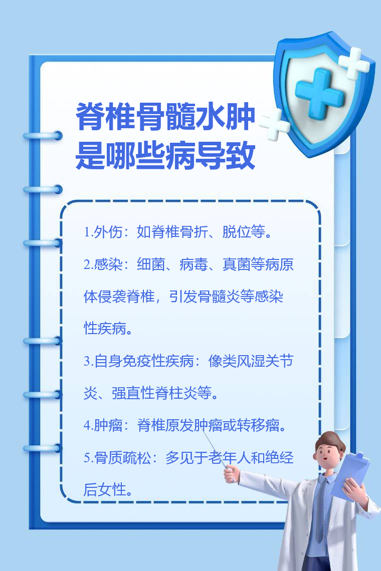 脊椎骨髓水肿可由外伤、感染、自身免疫性疾病、肿瘤、骨质疏松等导致。