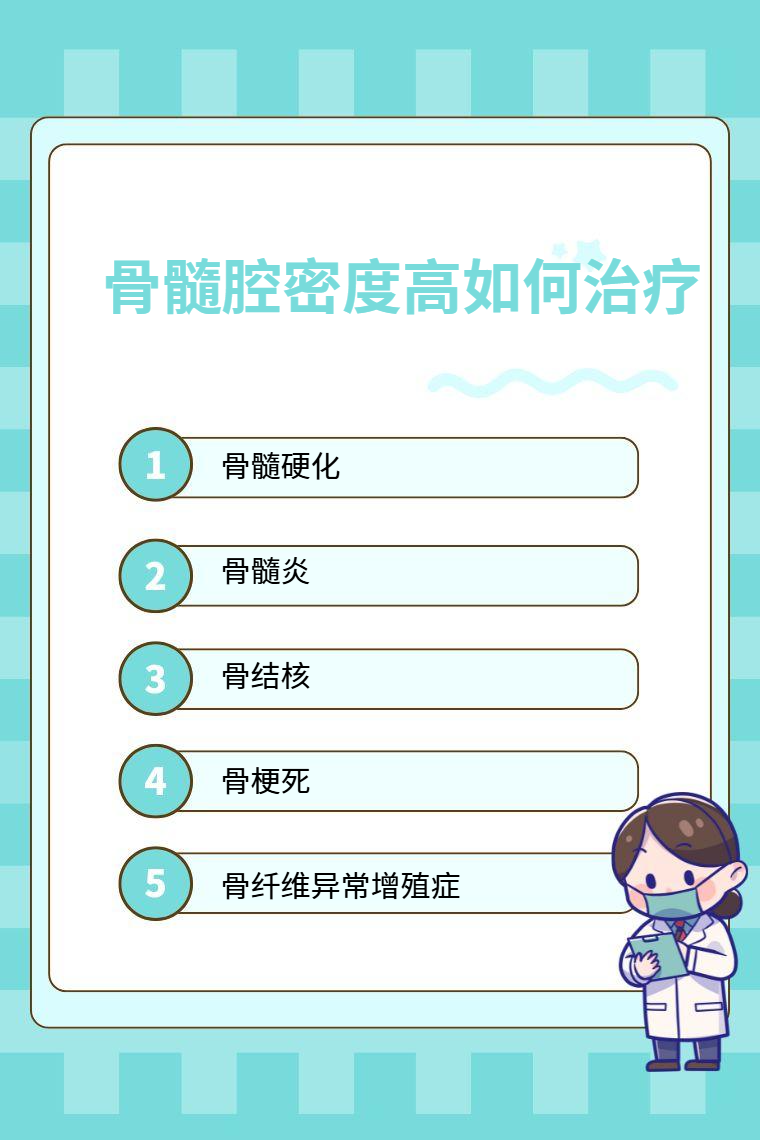 骨髓腔密度高可能是骨髓硬化、骨髓炎、骨结核、骨梗死、骨纤维异常增殖症等因素,需要针对病因治疗,可采取的方法有药物治疗、手术治疗等。