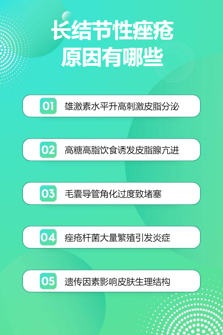 长结节性痤疮的原因有内分泌失调、皮脂腺分泌旺盛、毛囊皮脂腺导管角化异常、痤疮丙酸杆菌繁殖、遗传因素等。