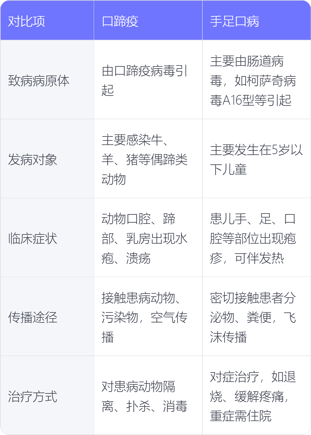 口蹄疫和手足口病在致病病原体、发病对象、临床症状、传播途径、治疗方式上存在不同。