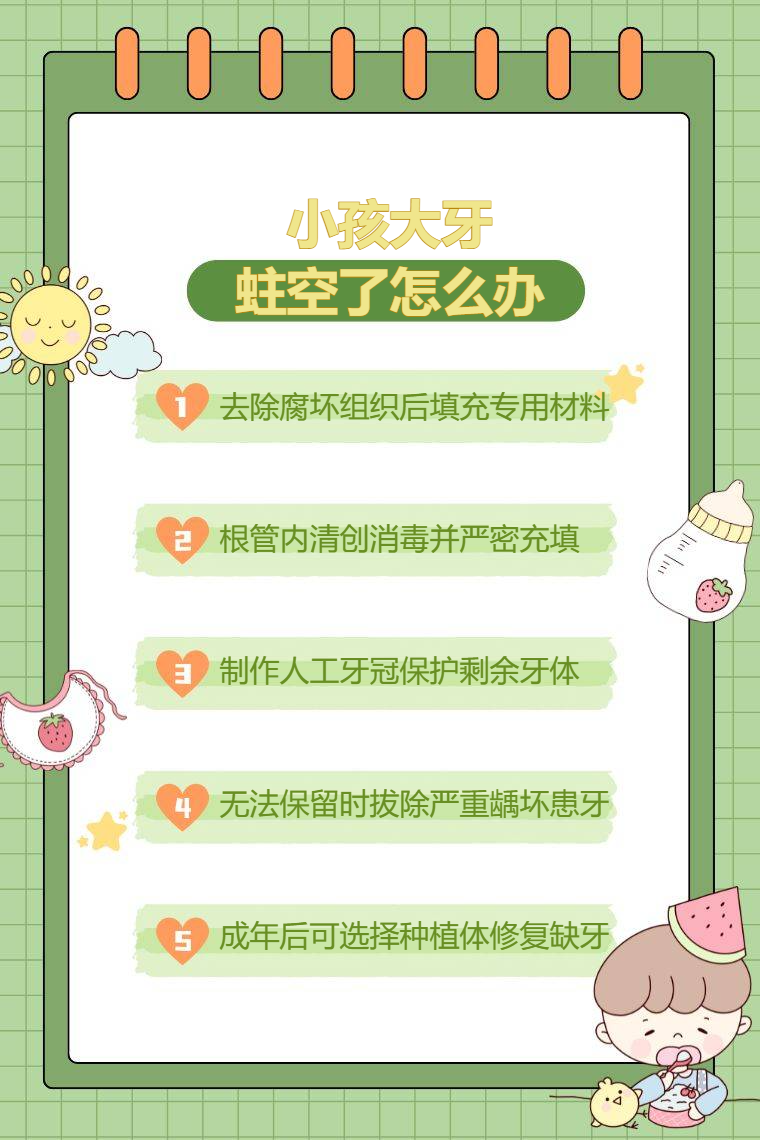 小孩大牙蛀空了可通过补牙、根管治疗、牙冠修复、拔牙、种植牙等方法处理。