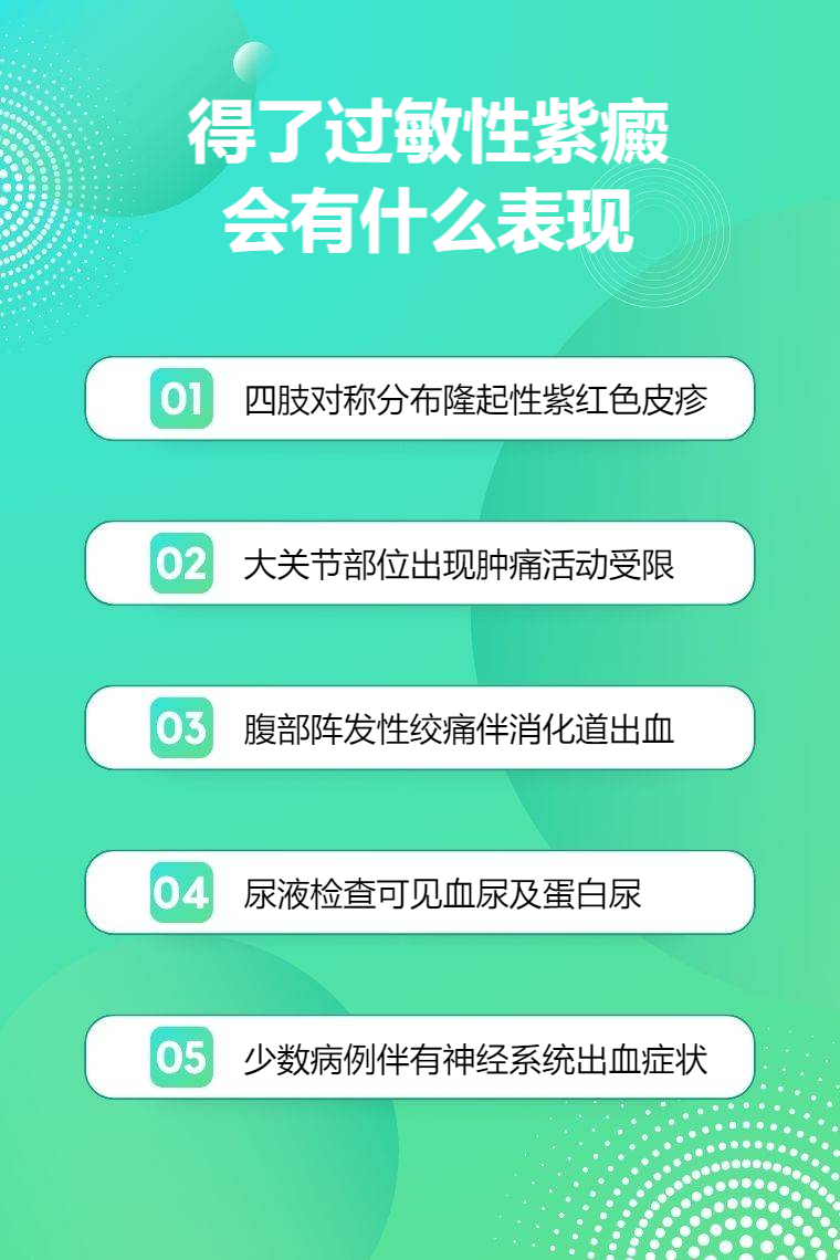 过敏性紫癜的表现有皮肤紫癜、关节症状、胃肠道症状、肾脏症状、其他症状等。