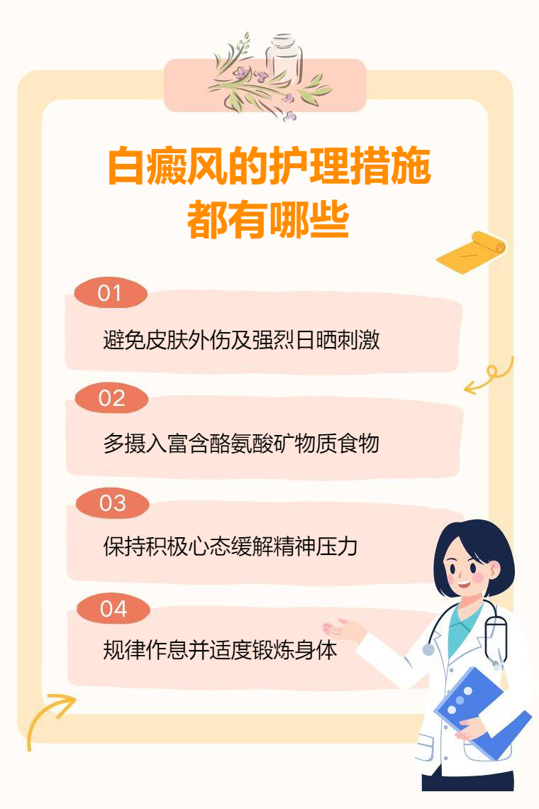 白癜风的护理措施包括皮肤保护、饮食调节、心理调节、生活习惯养成等。