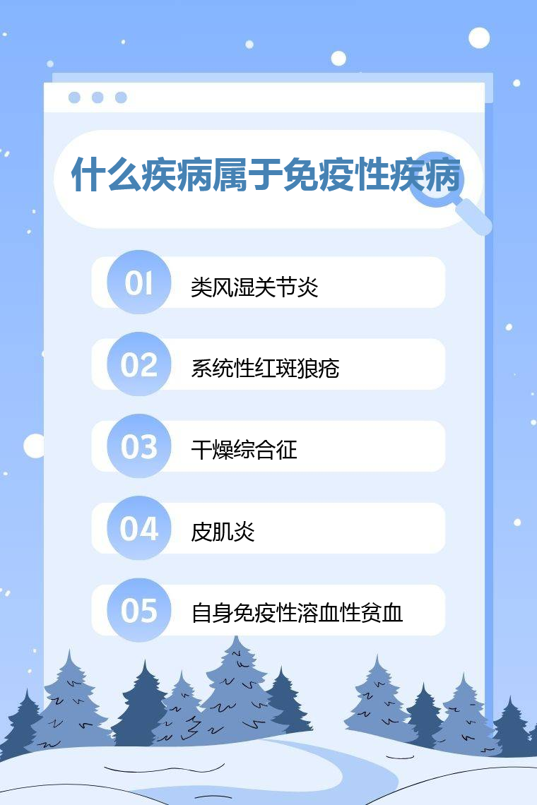 类风湿关节炎、系统性红斑狼疮、干燥综合征、皮肌炎、自身免疫性溶血性贫血等属于免疫性疾病。