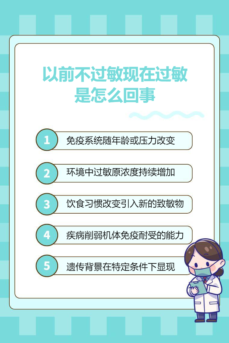 1. 免疫系统变化:随着年龄增长,免疫系统会发生改变,可能变得更加敏感,对外来物质的识别和反应能力出现变化,原本能耐受的物质,现在免疫系统却将其视为威胁并启动过敏反应。长期压力、睡眠不足、过度劳累等不良生活状态,也会干扰免疫系统的正常功能,使其稳定性下降,从而增加过敏的发生几率。