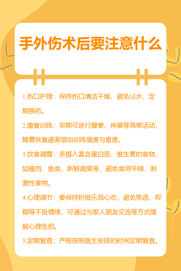 手外伤术后要注意伤口护理、康复训练、饮食调整、心理调节、定期复查等。