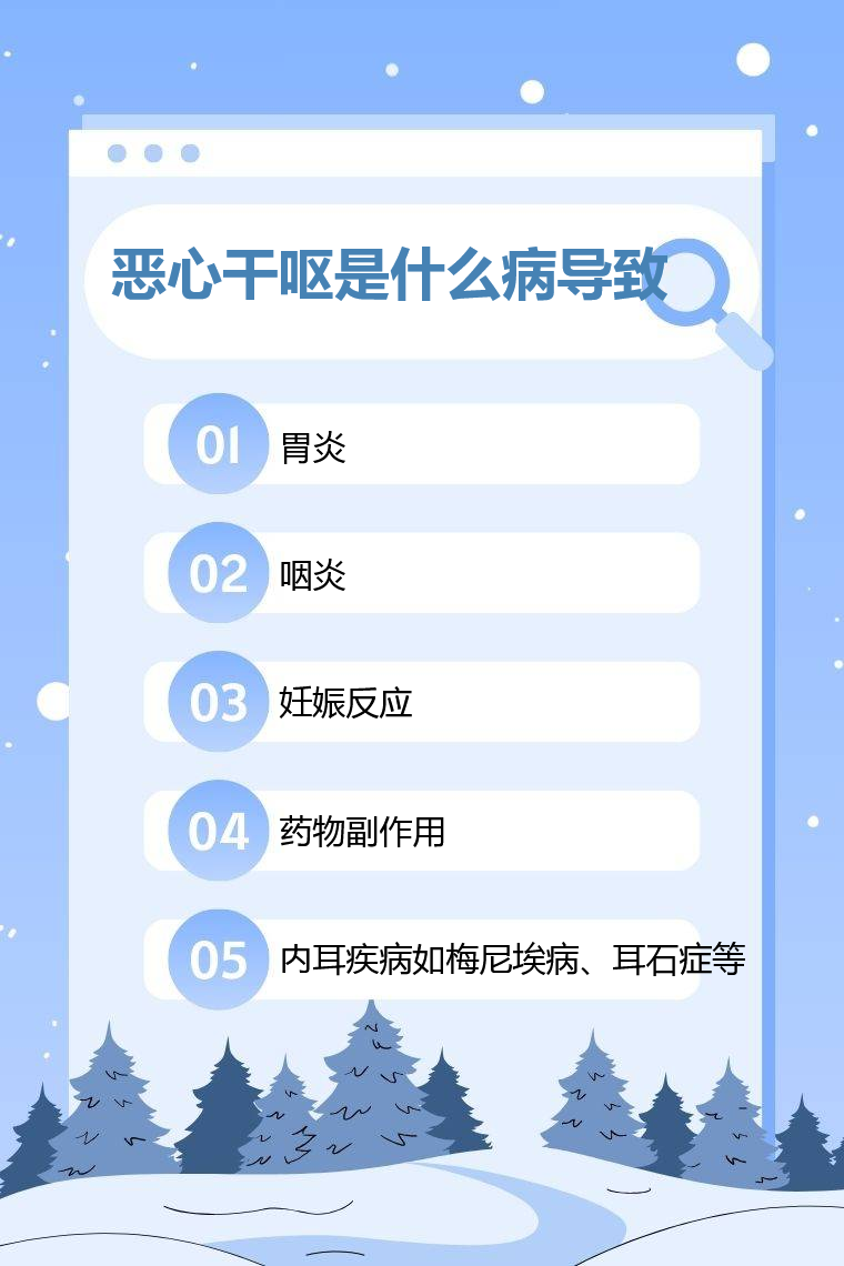 恶心干呕可能由胃炎、咽炎、妊娠反应、药物副作用、内耳疾病等导致。