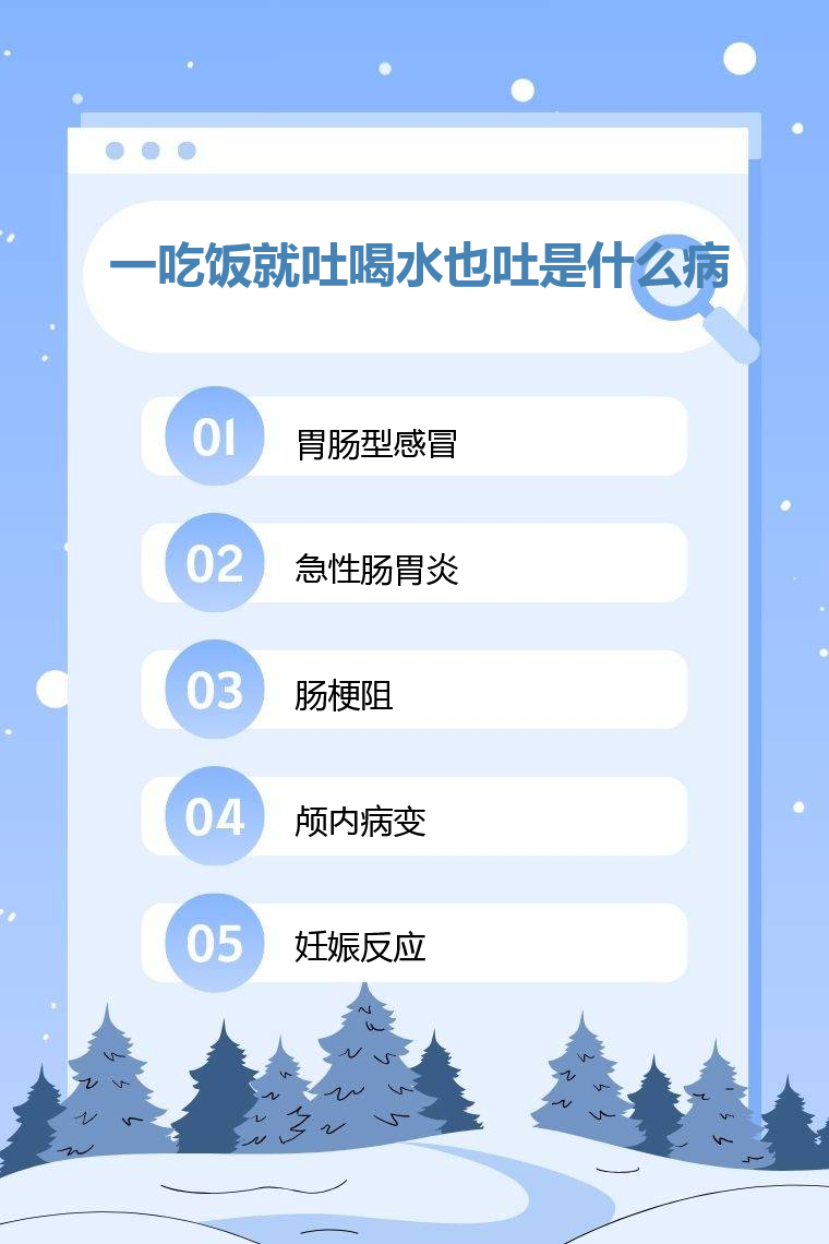 一吃饭就吐、喝水也吐可能是胃肠型感冒、急性肠胃炎、肠梗阻、颅内病变、妊娠反应等。