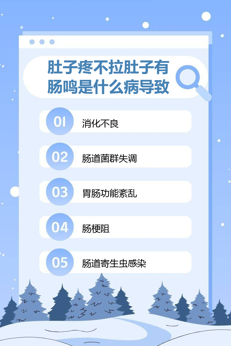 肚子疼不拉肚子有肠鸣可能由消化不良、肠道菌群失调、胃肠功能紊乱、肠梗阻、肠道寄生虫感染等情况导致。